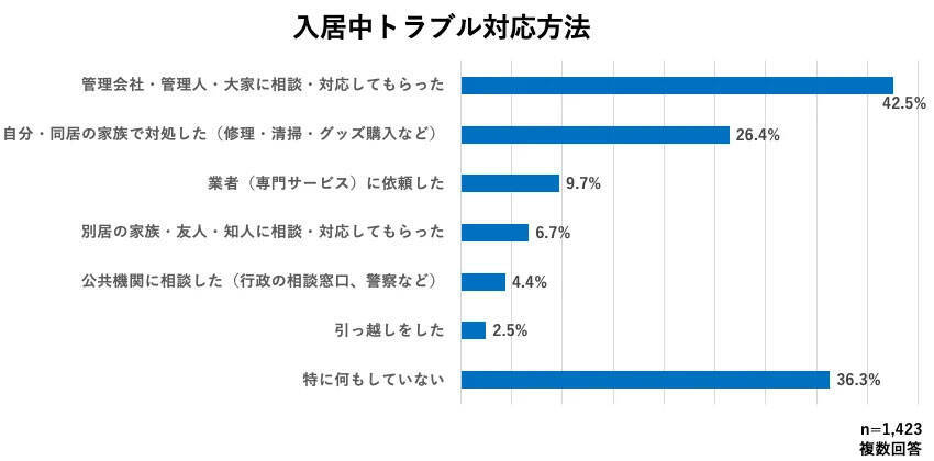 では、入居中に発生したトラブルはどう対応したのだろう? 調査結果によると、「管理会社・管理人・大家に対応してもらった」が42.5%で最多だった。次いで、「特に何もしていない」(36.3%)、「自分・同居の家族で対処した(修理・清掃・グッズ購入など)」(26.4%)となった。