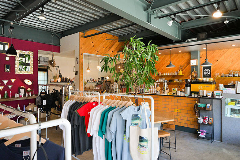 薬局だった建物を再利用しているのが、「Equinox STORE(イクイノックス ストア)」。トビチ商店街の先駆けとして、2021年3月にオープンしました。店内は壁などで仕切ることなく、コーヒースタンド、洋服メインのセレクトショップ、美容雑貨店がゆるやかに三等分してワンフロアを共有しています。