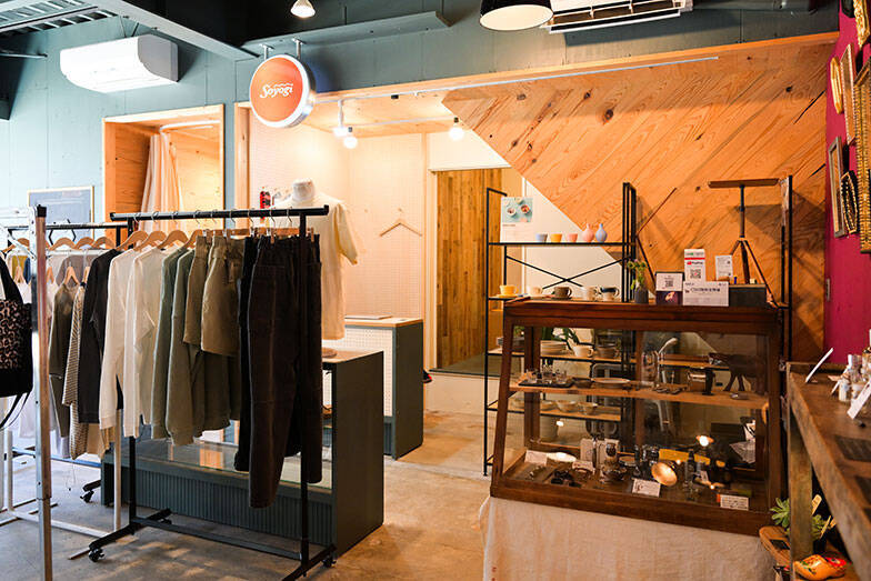 洋服や雑貨のセレクトショップ「Soyogi」を営むのは、お隣の伊那市出身の伊藤萌袈(いとう・もえか)さん。「以前この場所にあった洋服屋さんで働いていて、オーナーがこの場所を引き継いでお店をやってみないかと提案してくださって。いつか自分の店を開くのが夢だったので、ぜひやりたいとお返事しました。店名の『Soyogi』は、日常に豊かなそよ風を送りたい、という意味を込めて。質がよく、長く着ていただける洋服をそろえています」