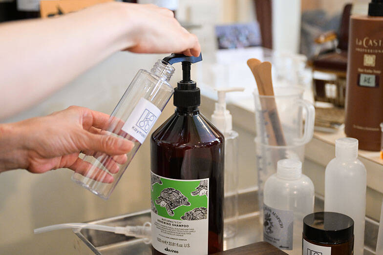 サロン専用のシャンプーは、気軽に試してもらえるよう量り売りに。薬局の調剤室をリノベーションした空間は、どこかラボラトリーのような雰囲気が漂います。