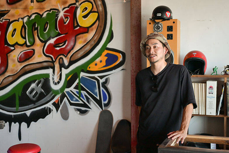 「goodhood」代表の鈴木雄洋さん。「&garage」の壁のイラストは、毎年アーティストに描いてもらっている(写真撮影/五味貴志)