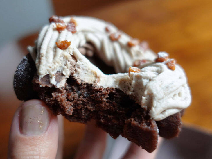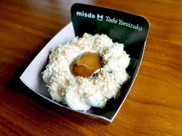 続いていただくのは「ノワドココ」。ガトーショコラドーナツをホワイトチョコでコーティングし、ローストココナッツをトッピングし、塩キャラメルクリームを絞った一品です。上品なビジュアルは、ドーナツというより、もはやケーキを思わせます。