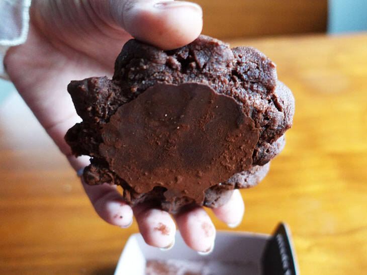 また、生地の下側は、2種のホイップクリームが穴からあふれてしまわないよう、チョコレートでコーティングされていました。ガトーショコラのサクホロ、ホイップのふわふわに加え、コーティングのパリパリッとした食感が楽しめることも魅力です。