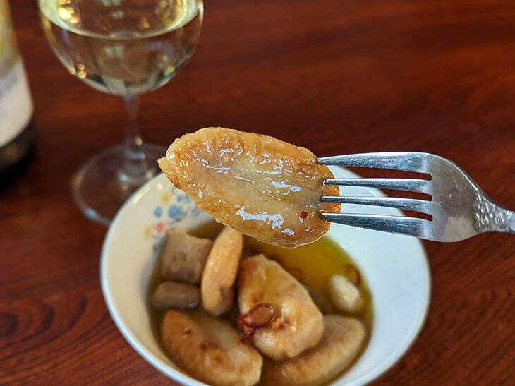 笹かまの食感、焼き目にもこだわり、オリーブオイルとニンニクの香りが作りたてのようなフレッシュさを感じさせます。マッシュルームとガーリック、鷹の爪も決しておまけではありません。存在感がしっかりあり、笹かまとの相性が非常に良いです。