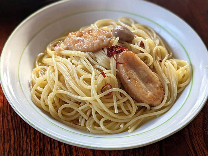 余ったオイルで作るペペロンチーノが、これまたおいしい。オリーブオイルに笹かまを始めとする食材の旨みがしっかり溶け込んでいるので、余ったオイルと塩コショウでバシッと味が決まります。