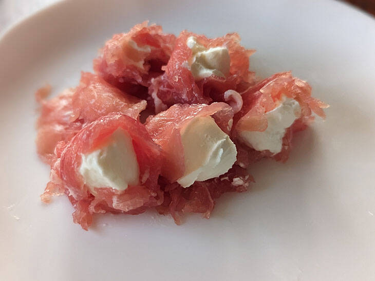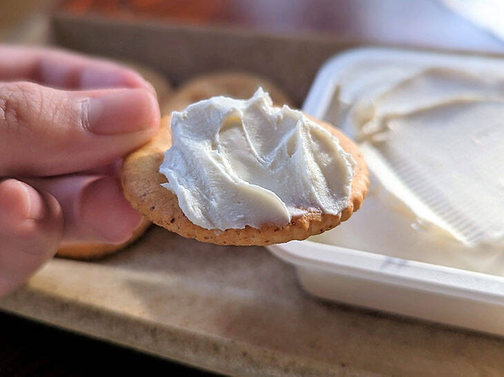 『武田の笹かまぼこ』のすり身と「蔵王クリームチーズ」を練り合わせた一品。軽い塗り心地で、とてもなめらか。全粒粉のクラッカーを用意したのですが、繊細な味なので、よりプレーンなものやバゲットの方が相性良く感じました。