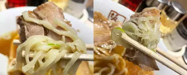 (左)スープ、ちぢれ麺にドンズバの焼豚。(右)焼豚とネギの親和性も再確認!
