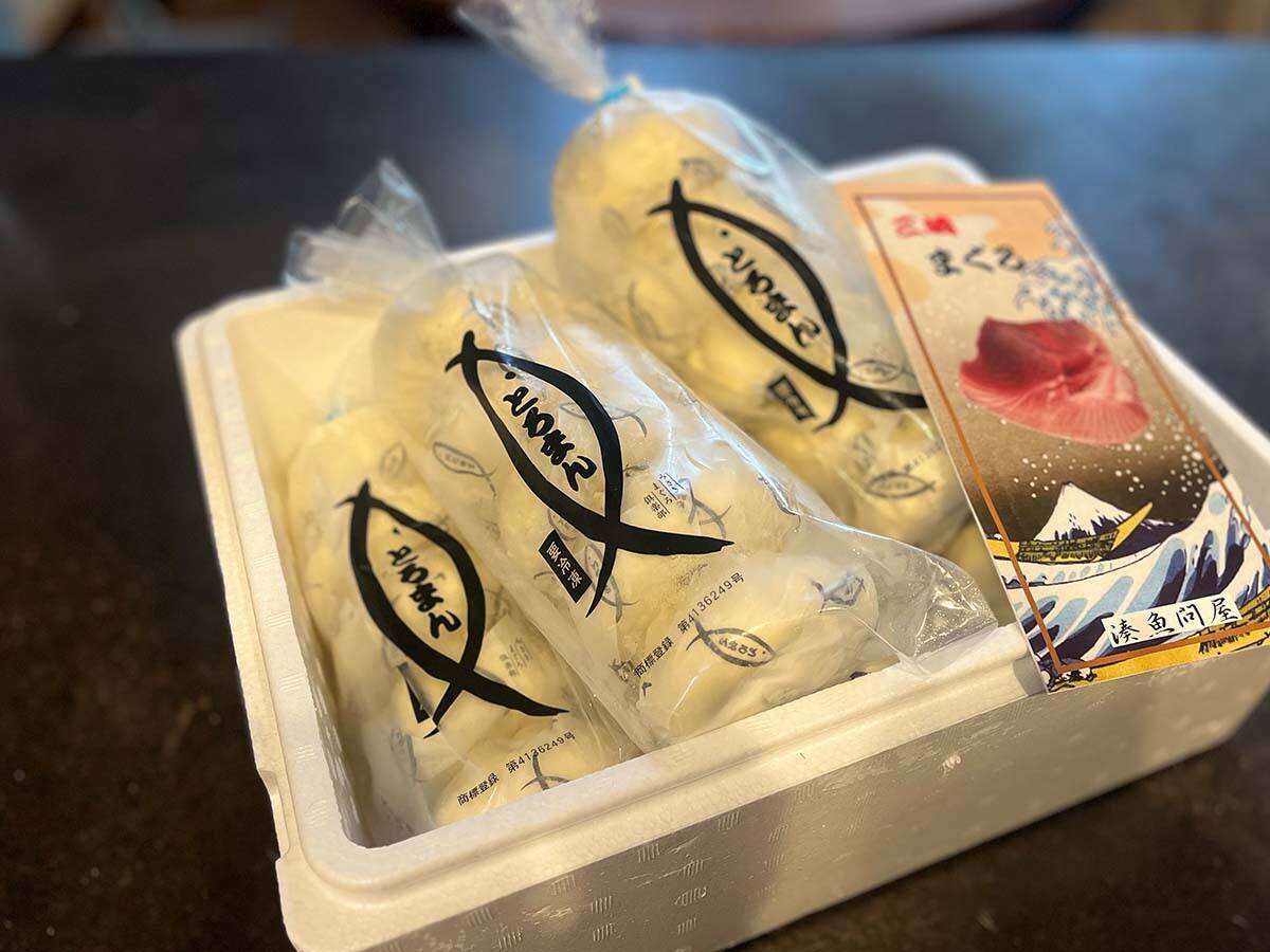 友人にも配ろうと多めに購入したところ、鮮魚が入っていそうな発泡スチロールのケースに入ってやってきました。マグロをイメージしたパッケージのデザインもどこか愛らしいですよね。