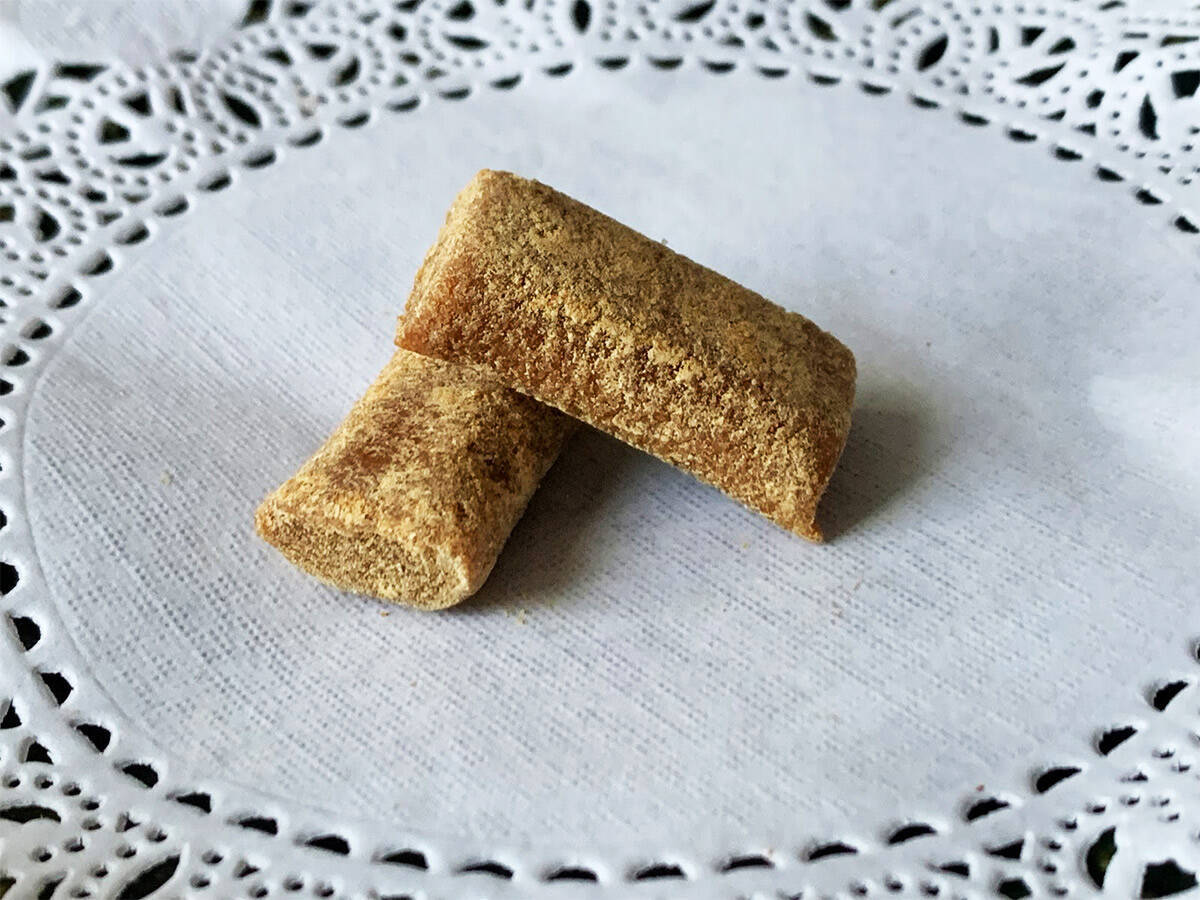 その中の1つ、「桔梗信玄飴」は、信玄餅で使用しているきな粉と黒糖を練り上げた飴です。信玄餅の最後に残った黒蜜ときな粉を“練り練り”して固めたことのある人ならわかる「あの味」です。柔らかな食感は、駄菓子のきなこ棒とそっくり。