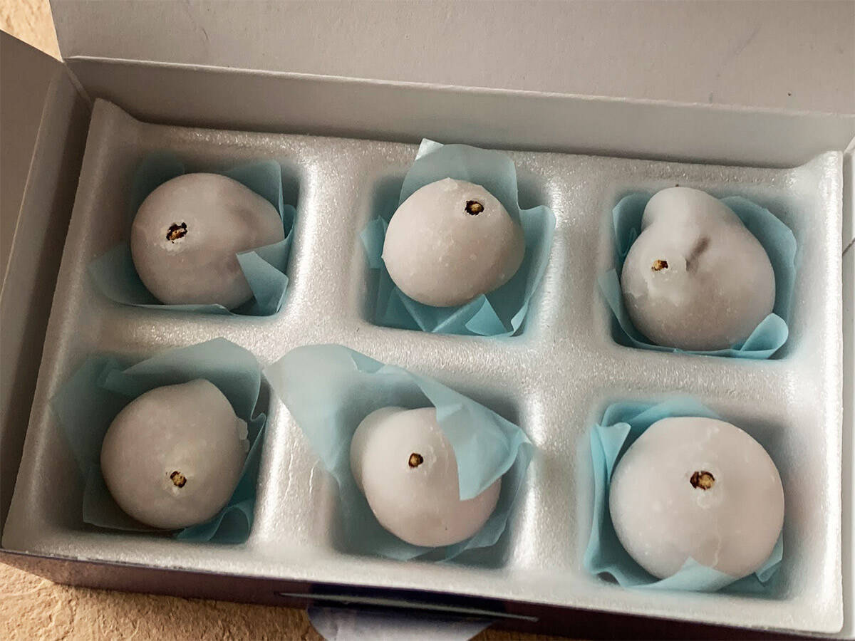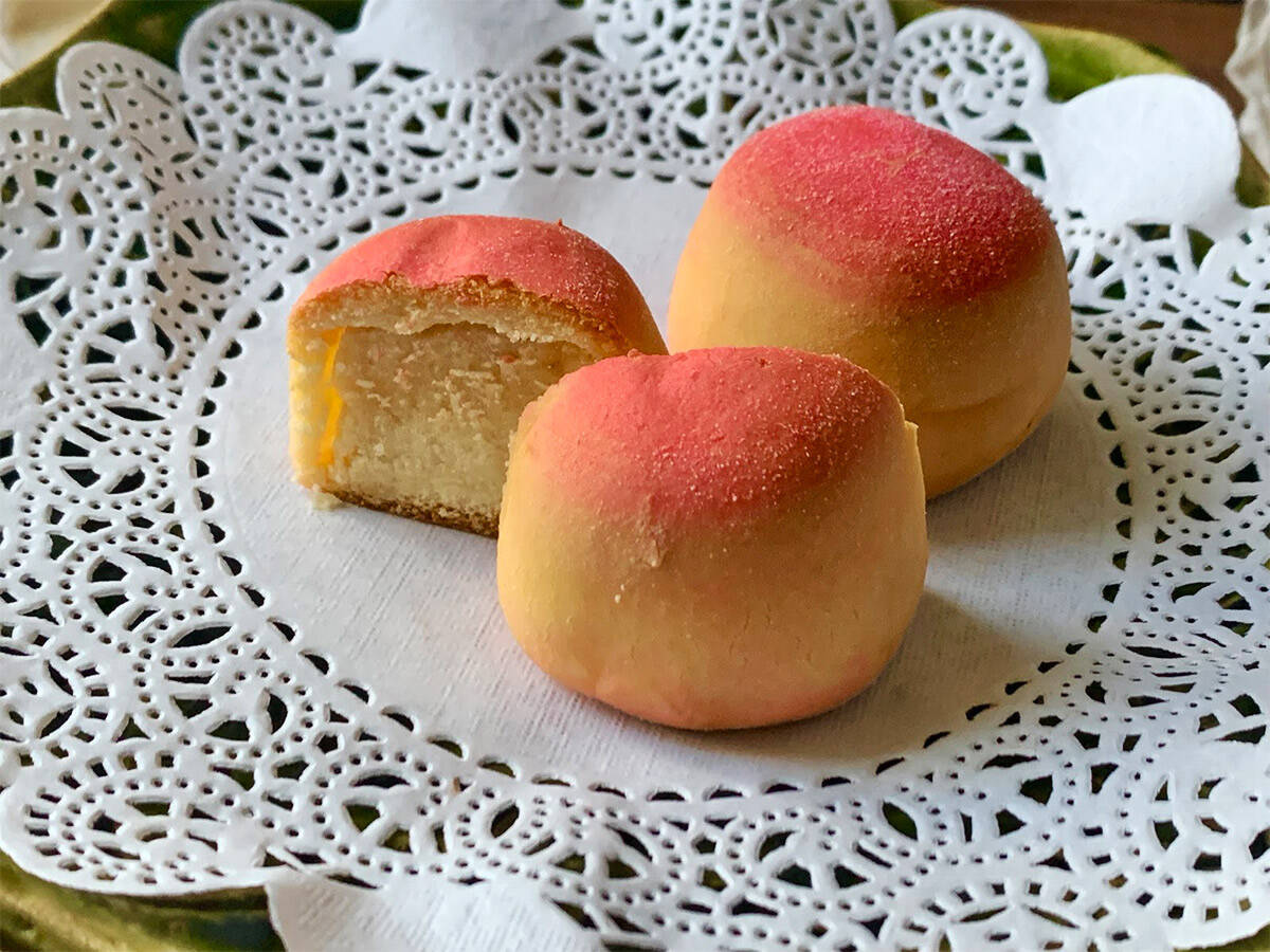桃のような手触りの皮の中は、細かく刻んだもものゼリーを混ぜ込んだ白餡がたっぷり包まれています。なめらかでしっとりとした白餡の口どけと、ふんわりとももの風味を感じるお饅頭です。