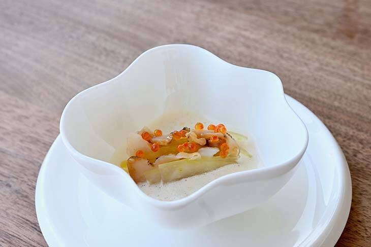 前菜の一品目は、スライスし火入れした冬瓜と、少し炙って同じくスライスしたつぶ貝をミルフィユ状に重ね、マスの卵をあしらっています。カツオの出汁と鶏のコンソメの合わせ出汁が香ばしさを包み込み、ムース状の酢の酸味に和の出汁の風味がしっかりと感じられる、まさにジャポニゼな一皿。