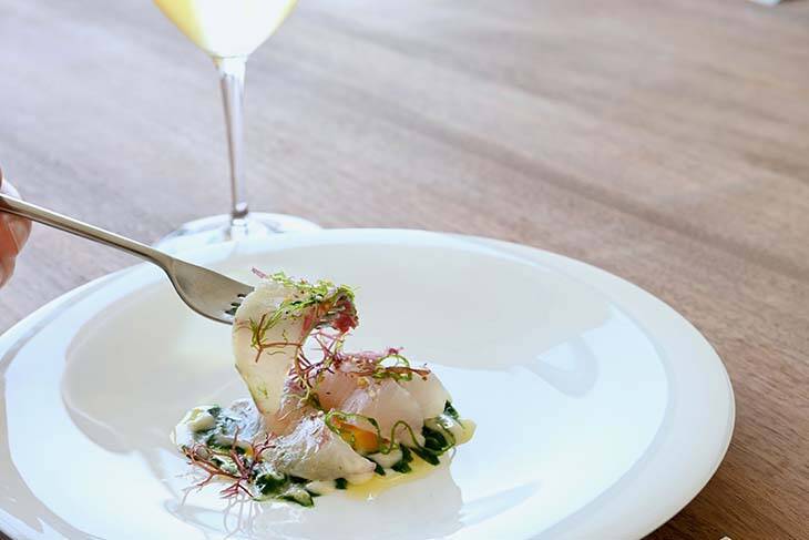 もう一品の前菜は、脂がのった縞鯵と二種類のソースを合わせたサラダ。貝出汁のベースに酸味を加えたドレッシングと、鮮やかなモロヘイヤのソース。ニンニクやアンチョビが加わり、コク深く濃厚ながら爽やかな味わい。さらに、塩もみしたコリンキーや海藻の歯ごたえもアクセントになっています。