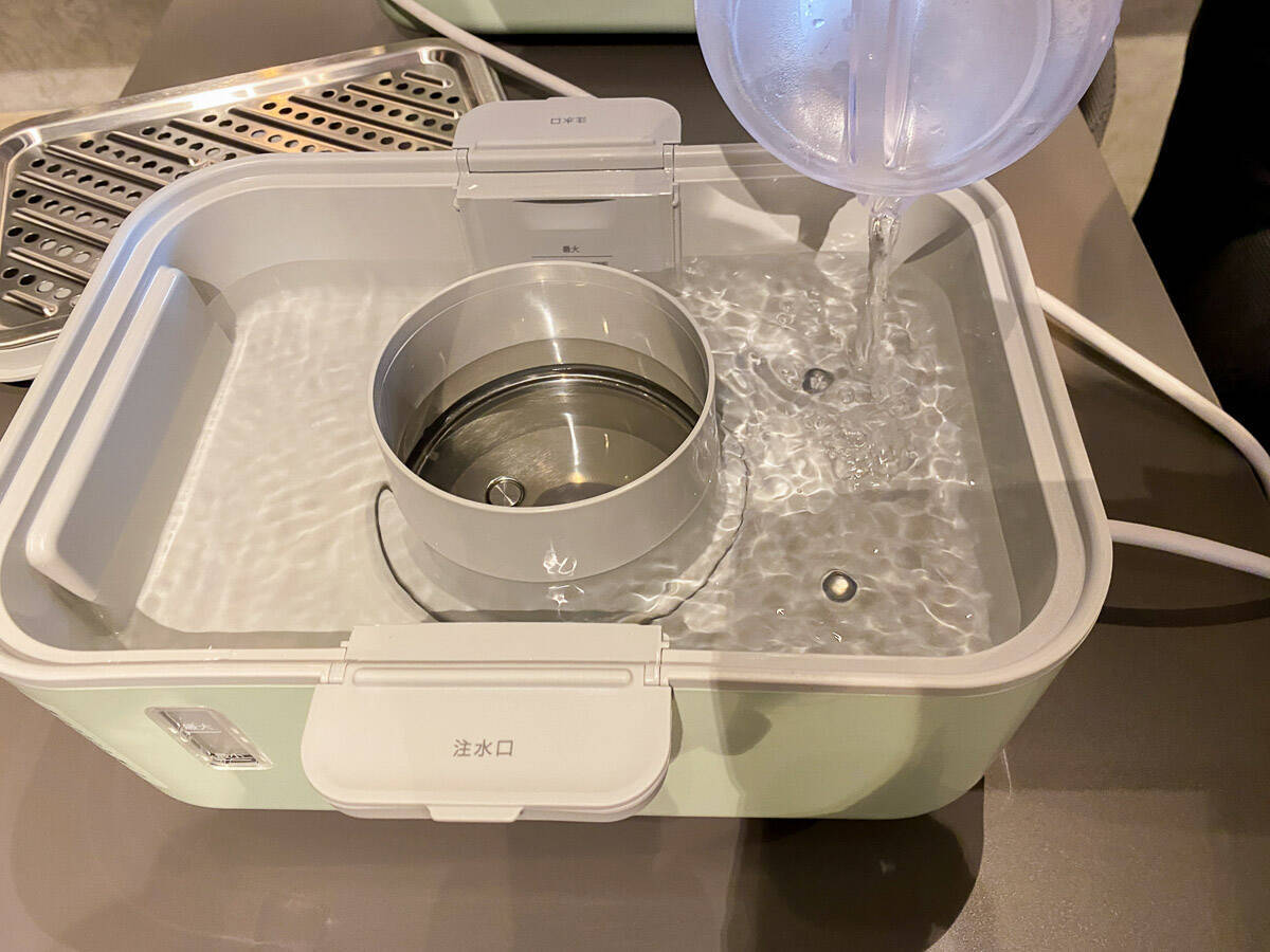 スイッチを押すと、まもなく内部が蒸気で満たされていきます。普通の蒸し器は水滴が食材の上にも落ちるのですが、BYDEEMは水滴が側面に落ちて溜まる構造になっているので、食材にフタをしなくても水っぽくなりません。