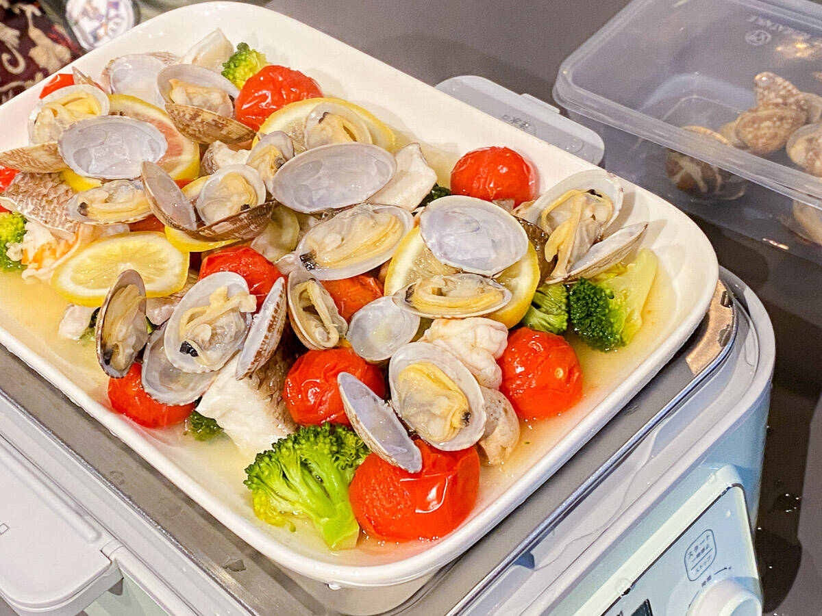 タイマーをセットして「スチーム(急速)」で30分。蓋をとるとあさりが口を開き、アクアパッツァが仕上がっていました。試食をすると魚がふっくらと仕上がっていて、ブロッコリーはややシャキッとした食感が残り、普通にフライパンで作るのよりもあっさりとした味わいに感じました。