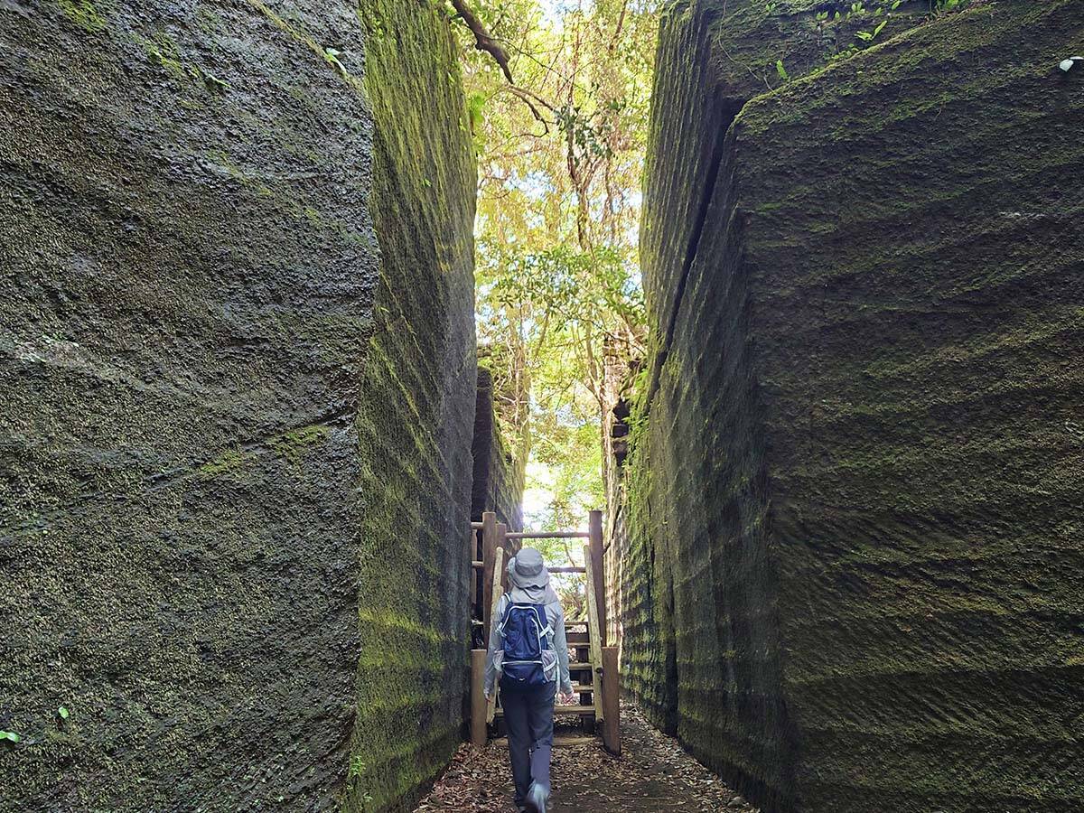 房州石を運び出すために作られた切通し跡も通ってみて。石を切った跡がくっきり残った上が苔むし、上から緑が覗く様子は、とても幻想的。異界に迷い込んだ気分になるかも。