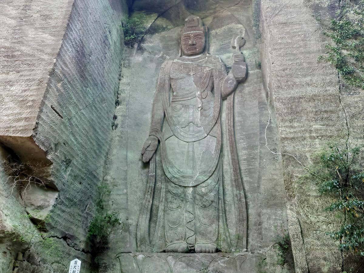 登山コースを利用すると北口管理所から日本寺へ入ることが多いです。入ってすぐ目にするのが、百沢観音。がけに彫られた一尊に感嘆のため息がこぼれます。