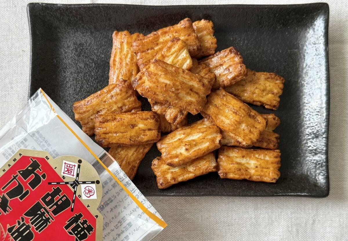 「横濱塩ダレ」は、香味野菜とコクのある調味塩を使った、塩ダレ風の味わいが特長のあられ。おやつでも良いのですが、やっぱりお酒が飲みたくなるあられです。