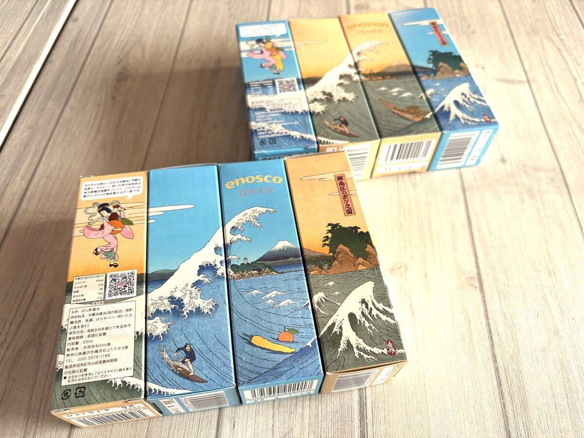 「江のスコ」の箱には材料の橙と黄金唐辛子が波に乗っていたり、「江のポン」の箱には材料の醤油が船に積まれていたりと、随所にこだわりが光るデザイン。湘南の海からの景色、波や富士山を江の島と共に描いている点も悔しいほど秀逸な仕上がりです。