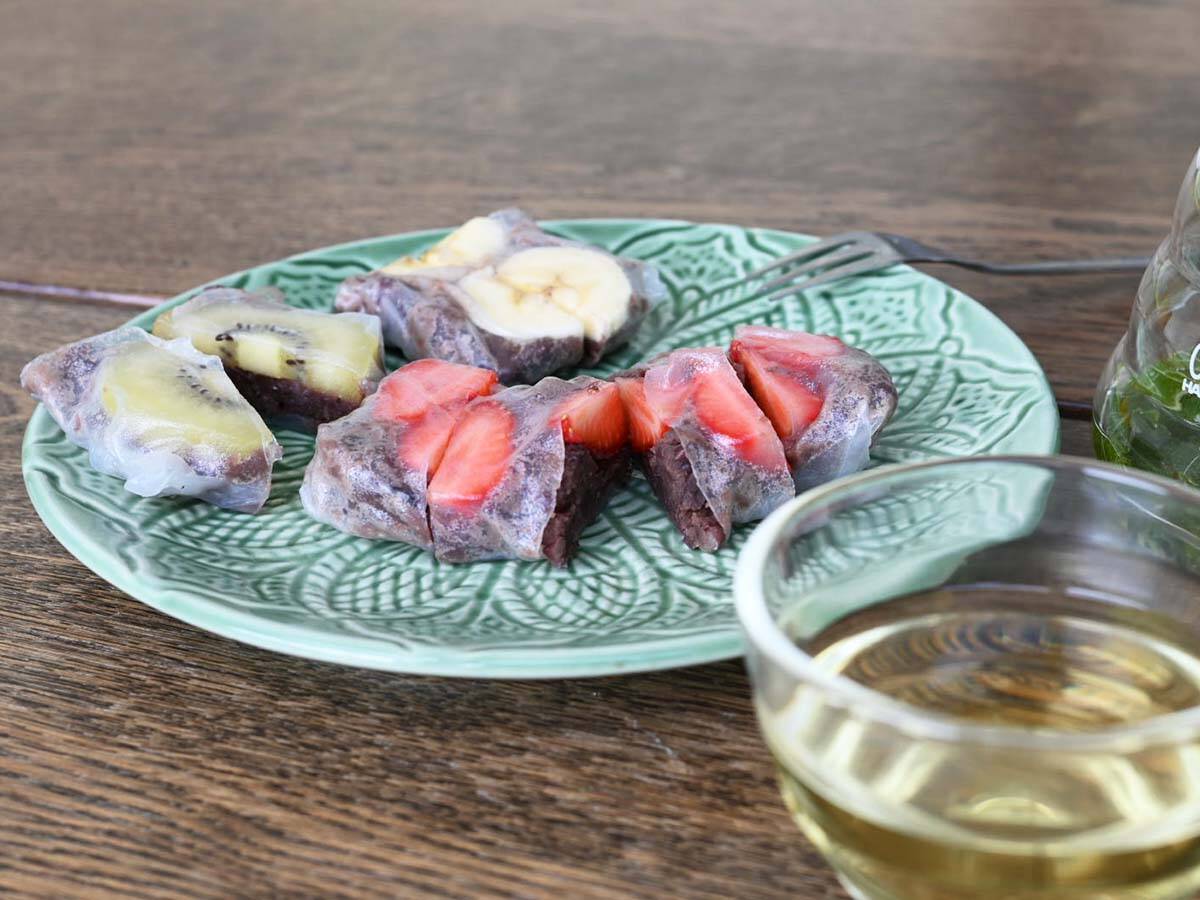 こんなふうに小さく切って、おもてなしのおやつとして家族や友人とつついて食べましょう。あっさりしたライスペーパー巻きなので、あんこ本来の美味しさが際立ちます。フルーツの酸味を加えるとよりジューシー。バナナ、キウイ、旬のフルーツと合わせてさっぱりといただきましょう。