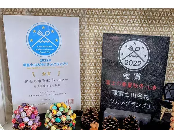「環富士山名物グルメグランプリ2022」の認定証と溶岩の盾