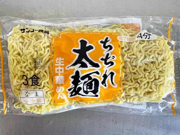 『ヤマザワ』のグループ企業・サンコー食品というメーカーによるオリジナル麺で、その名の通り、見た目は黄味がかった縮れた太麺。おそらく山形県内のいくつかの人気ラーメン店のインスパイア的に開発された麺だと思いますが、小麦の風合い、コシ、喉越しのクオリティは有名製麺所のそれを凌駕するほど。さらに縮れた太麺加工の効果でラーメンを食べる際、スープが持ち上がってくれる効果もあります。