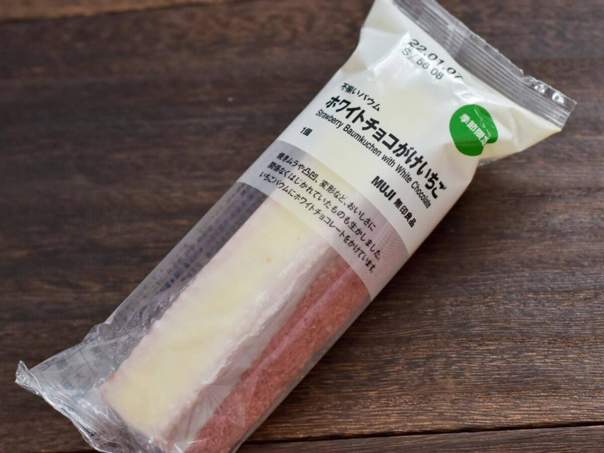 こちらも定番の”いちごバウム”にホワイトチョコレートがかかった特別仕様。いちごとホワイトチョコレートの組み合わせなんて、子どもから大人までテンションの上がる組み合わせですよね。パッケージを開けて改めて見てみると、ホワイトチョコの白色といちごバウムのピンク色のコントラストが可愛らしく、見た目からハートを撃ち抜かれます。