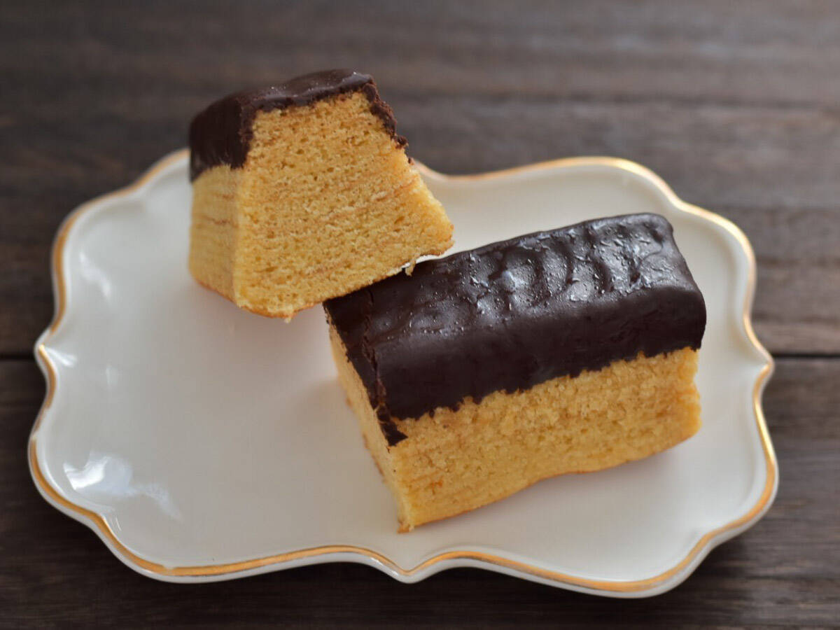続いては、定番の「紅茶バウム」にホワイトチョコレートがかかった「ホワイトチョコがけ紅茶」を実食。こちらはチョコレートがホワイトチョコになっています。甘いイメージの強いホワイトチョコレートですが、やっぱり全体的に甘さが立つ味わいなのか気になるところ。いざカットしてお皿に盛り付けます。