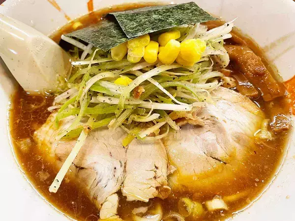 コク深くまろやかでありながら、一度食べると忘れることができなくなる醤油ベースのスープ。その上に辛味のあるシャキシャキのネギ、コーン、ホロホロの焼豚、海苔などが乗っています。スープだけでも十分旨い一杯ですが、これらの具材によってさらに贅沢な味わいを楽しませてくれます。