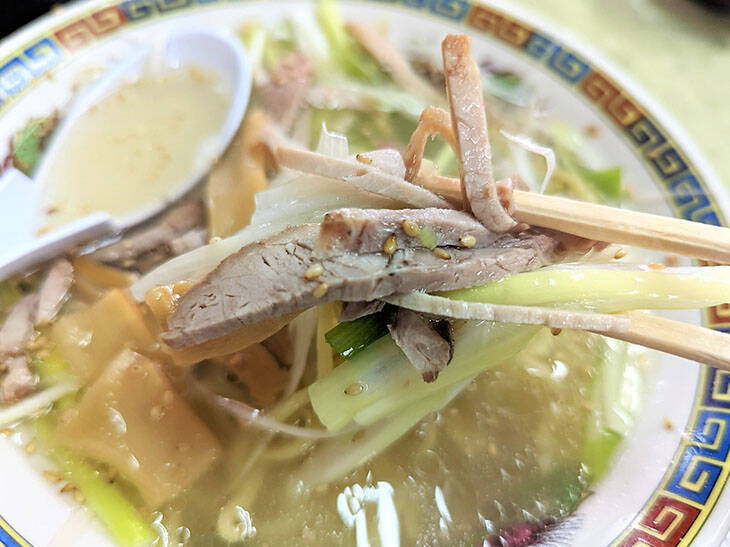名物の「ネギラーメン」(しお)が着丼しました。「ネギラーメン」は塩または醤油から選べますが、まずは塩をお試しください。函館の塩ラーメンには味の系統がいくつかあり、仮に正統派代表を『滋養軒』とするならば、進化形代表は『あじさい』、『西園』はその中間の“バランス型”。だいたいの店が正統派か進化形のいずれかに近い味に分類されますが、『西園』の場合はオリジナリティの要素も強く、唯一無二の一杯を堪能できます。