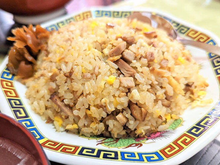 さてお腹に余裕があるならば、ぜひ「炒飯」も注文してみてください。先ほどのチャーシューがたっぷり入っていて、卵も惜しみなく使っている印象です。どこにレンゲを入れても、チャーシューが大量に米と絡んでいて、ラードで炒めているのか、米がつややかで絶妙なこってり具合。パラパラすぎず、しっとり感も備えたバランスのよい一品です。