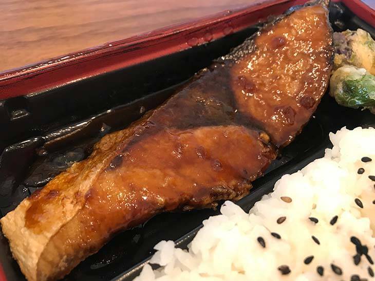 見逃してはならないのが、箸休め的存在の付け合わせ。特に、あっさりしたナスとししとうの天ぷらは、濃厚なブリ照りとベストマッチ。テイクアウトで20分ほど経った後でも衣はサクッとしたままで、付け合わせとしてはなかなかのポテンシャルの高さ。きんぴらごぼうやしば漬けも、箸休めにはぴったりでした。