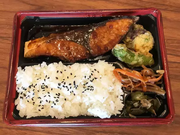 お弁当を構成するのは、長崎県産天然ぶりの照り焼き、ごはん、ナスとししとうの天ぷら、きんぴらごぼう、しば漬け。和食の美味しい惣菜が存分に楽しめる内容となっています。天然ぶりの照り焼きが存在感を主張しつつ、サイドの付け合わせも気を抜いていない仕上がりが好印象。