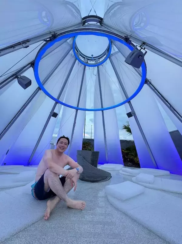時間になると水風呂へ移動。なんと浴槽にスピーカーが仕込まれていて、頭まで浸かるとイルカやクジラの鳴き声が聞こえるといういまだかつてないサウナ体験。さらに海沿いの外気浴で潮風を浴びるのが最高!