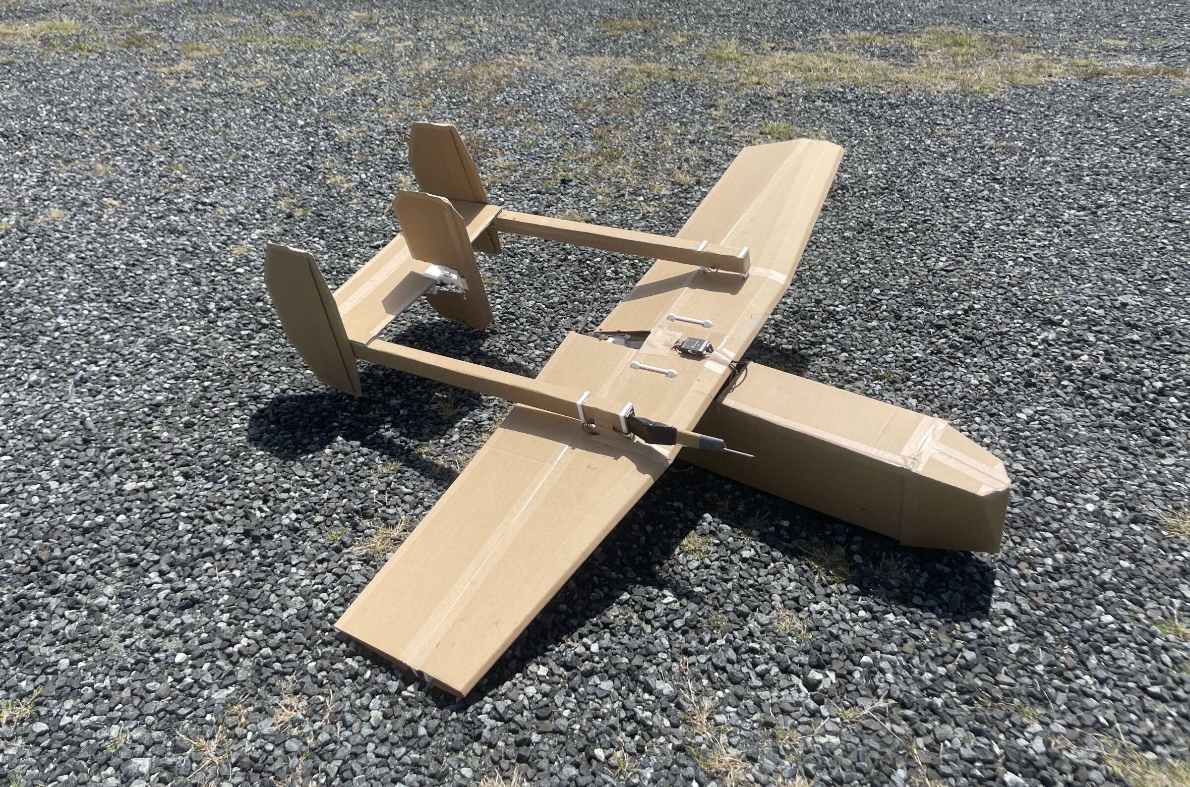 ヘリコプター型ではなく飛行機型にしたのは、速く・長く飛べるから。最高時速120キロ!飛行時間はヘリコプター型が数十分~1時間程度のところ、この段ボールドローンは1.5時間飛行可能です。