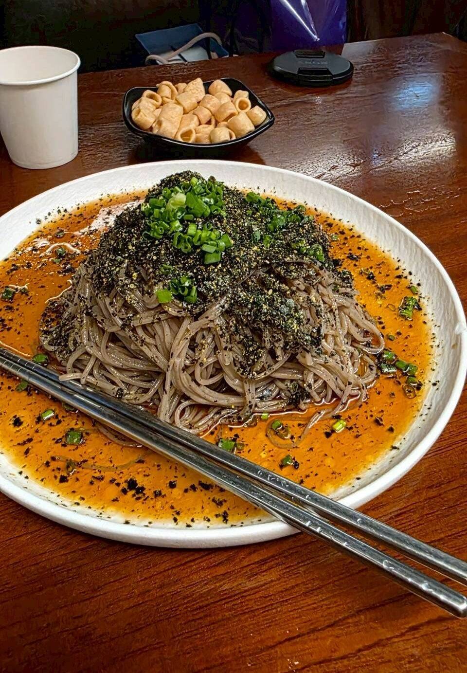 要は、韓国のそば粉を使った冷麺「マッククス」に、エゴマ油(トゥルギルム)をたっぷり絡め、海苔やゴマをトッピングして食べるヘルシーで香ばしい混ぜそば料理!(十割蕎麦ではないので、小麦が入っています)