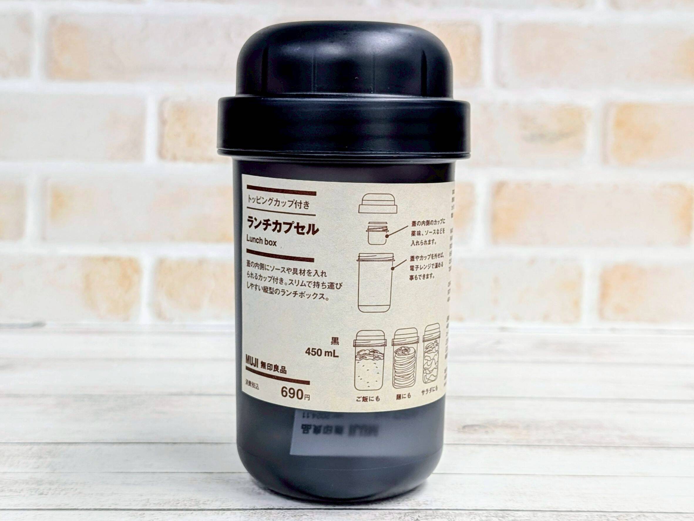 まずは今年大きな支持を集めた「トッピングカップ付き ランチカプセル」。水筒のような縦型デザインのランチボックスで、スリムな形状が特徴です。素材はポリプロピレンで、カバンにもすっきり収まります。