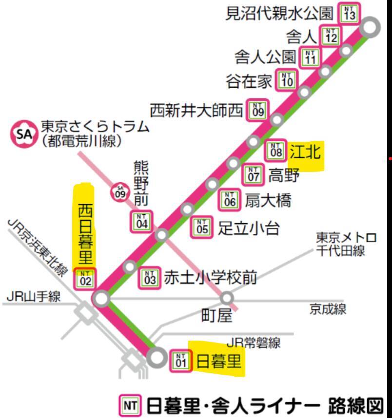 日暮里・舎人ライナーの真ん中あたり、足立区の江北駅から日暮里駅までの直通バス。途中の西日暮里で途中下車できます。(朝7時、7時25分、7時45分江北駅発)