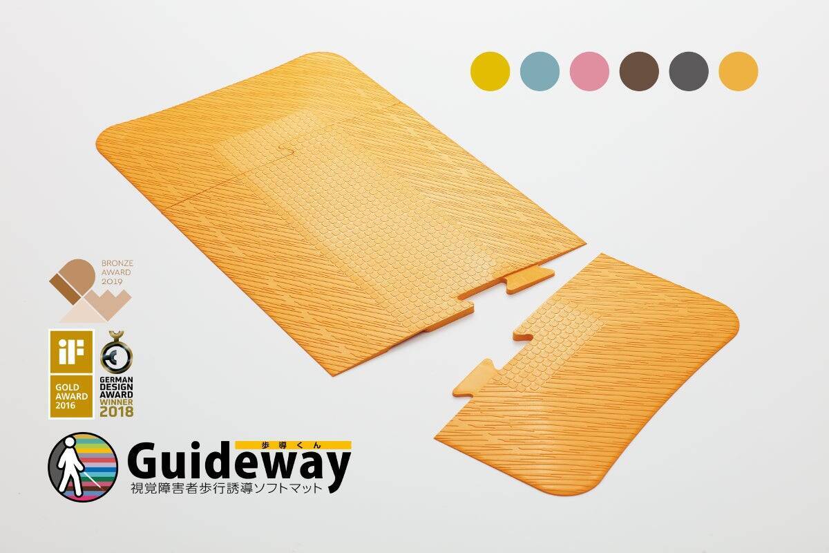 およそ30センチ四方のゴム製のマットで、ジグソーパズルのような形になっていて、任意の長さにつなげることができます。点字ブロックを設置する場合、床を削る大がかりな工事が必要ですが、 「歩導くんガイドウェイ」は、美術館や博物館、イベント会場など、 日によって人の流れが変わる場所でも、貼るだけで使えるのが特徴です。
