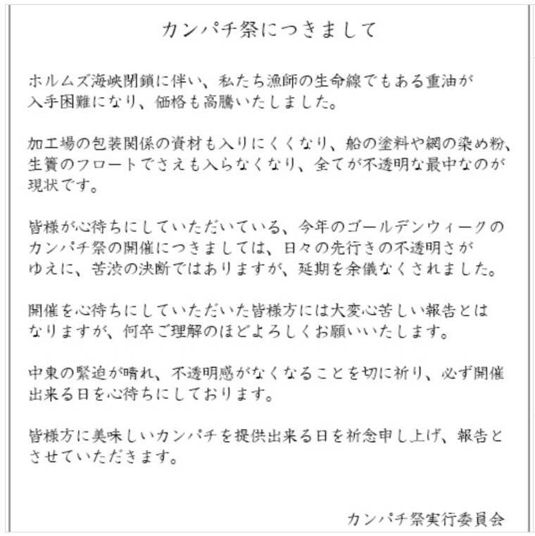 <2026年の実施延期が発表された「垂水カンパチ祭り」の案内(垂水市漁業協同組合のインスタグラムより)>今回5月3日(日)に行うところだったんですけれど、それを延期にしました。延期です。ちょっとホルムズ海峡の影響で、「重油」の方が入手困難になったものですから、「やってる場合ではないですよね」っていう決断をいたしました。