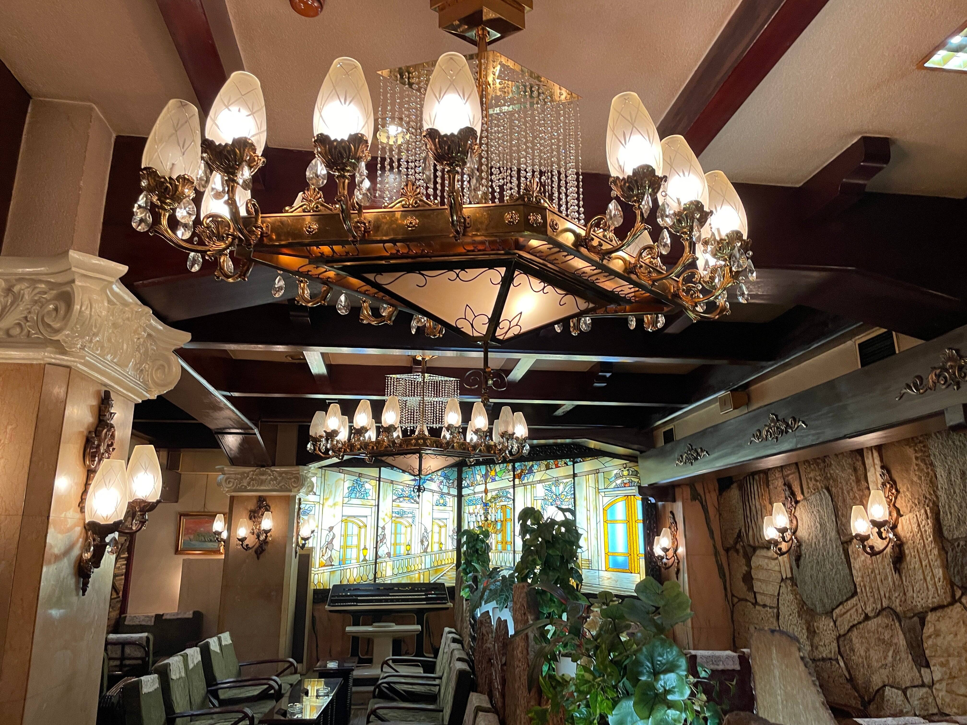 ▼こちらのお店は何といっても、昭和レトロなインテリアが特徴的。お店に入ると、天井にはシャンデリアが。ほかにも、ヨーロッパの城をイメージしたインテリアや、ロシア皇帝の旧城エルミタージュを描いた壁一面のステンドグラス。