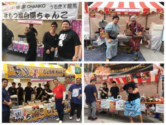 中継でご紹介しきれなかった4メニューも魅力的なもの揃い!東京・中野富士見町「北乃里」では、元貴乃花部屋の貴翔馬さん(写真右上)が店頭に立たれ『ゴマ味噌美人豆乳ちゃんこ』を販売。自家製のつみれが絶品でした!東京・三鷹「雷炎ちゃんこプロジェクト」からは『赤鶏だしの海鮮味噌ちゃんこ』。相撲芸人でもある元伊勢ケ浜部屋の安大ノ浪さん(写真右下)が会場を盛り上げられていましたよ。池袋にある「蔵之介」からは『炭焼きあごだし!王道しょうゆちゃんこ』。元二所ノ関部屋の幕下 倉知関が営んでいたお店です。