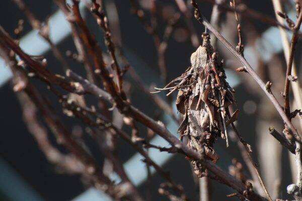 ▼自ら吐き出した糸で木の枝にぶら下がるミノムシ