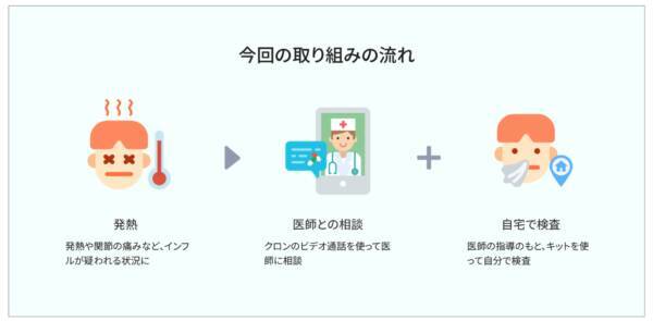 今回の実験は、国の実証実験制度「規制のサンドボックス制度」を利用したものです。基本的にインフルエンザ患者の診断は対面診療が原則なので、画面越しにお医者さんが出来るのはアドバイスまで。利用者は事前に検査キットの説明会に参加する必要がありますが、「インフルエンザかもしれない…」と思ったらアプリ上で問診を受け、画面越しの医者の指示に従って検査を行います。その結果医師が病状を判断し、「出勤を控えるべき」「医療機関にかかるべき」などの助言が得られる、という流れです。