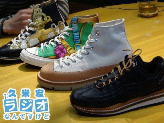最近はソールだけでなくアッパー(上の部分)のカスタマイズも手がけるようになり、仕事がますます面白くなってきたと廣瀬さんは言います。エルメスのスカーフをアッパーに仕立てたカスタマイズスニーカーを手に取った久米さんは、「インスタグラムで見るよりも、実物のほうがはるかにかっこいい! みんな実物を手に取ったら、欲しくなるでしょう」。