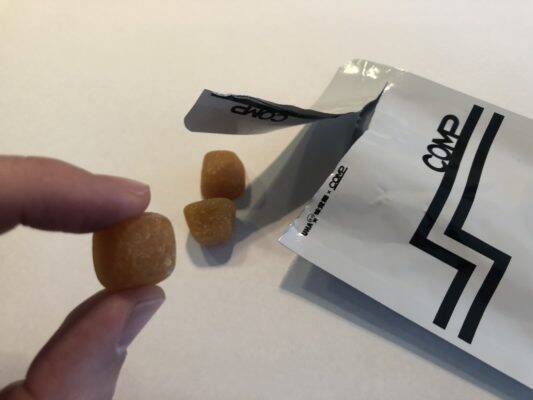 ▼実際にスタジオで毅郎さんと泰子さんも試食した「COMPグミ」。今よく売られているハードタイプのグミのような食感。オレンジのような味で美味しいです。