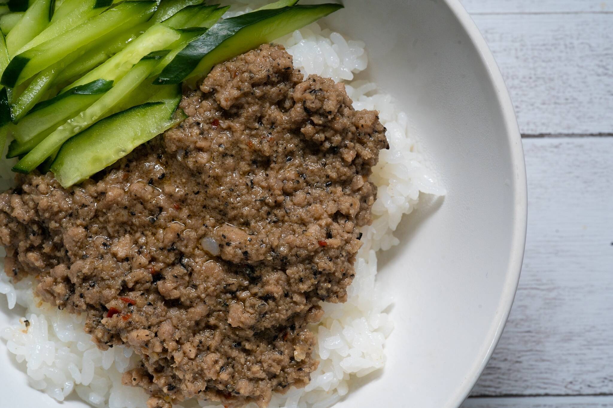 「まずは油を熱してから」みたいな作業がないわゆる「コールドスタート」っていう調理法が注目されています。火にかけずに冷たい状態のフライパンの中に材料とか調味料を入れて、そこから炒めたら完成するもので、今回のジャージャー丼もこの方法。炒めると固くなるイメージの豚ひき肉ですが、このジャージャー丼はとても柔らかくてジューシー。ゴマについては白ごまではなく黒ごまの方が見た目や風味がよくてオススメです!子どもに食べさせるときは、豆板醤の量で調整してみてください。