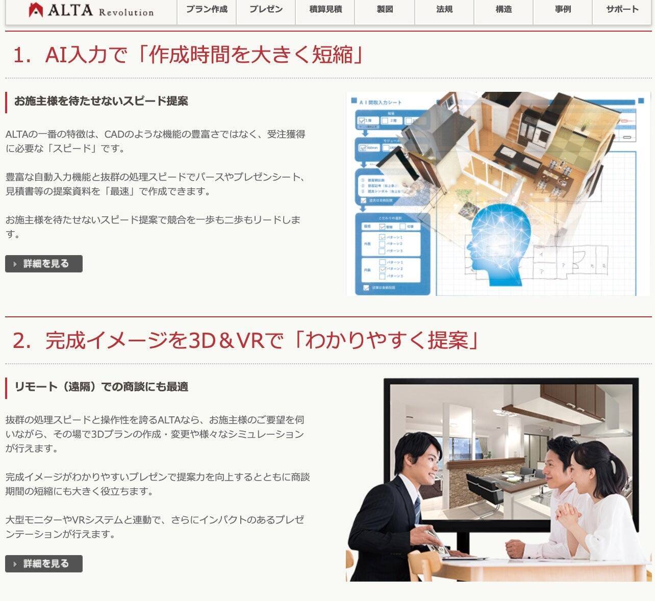 VRで見ることも出来るんです。手書きで間取り図を書いただけで、パソコンの中にあっという間に住宅が3Dで出来て、そしてVRで、まるで住宅展示場のように、その中に入り込んで、床材の変更やキッチンの内容の変更などを目の前で確認することが出来ます。▼ALTA Revolutionの公式サイトから