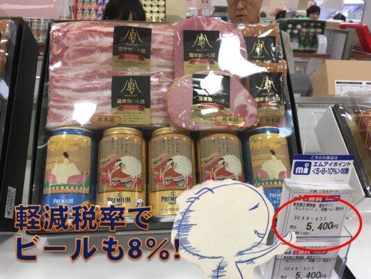 ビールはこの10月から消費税10%となりましたが、このビールセットは8%。というのも、国税庁のルールで、「セット物」の販売については、税抜き価格が1万円以下で、食品の価格の占める割合が3分の2以上なら、軽減税率になる・・・というルールがあるんです。