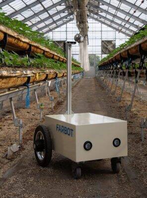 共同研究で開発が進められているのは、「FARBOT(ファーボット)」という愛称の、AIを搭載したロボットです。イチゴが栽培されるビニールハウスを自動走行し、現在収穫可能なイチゴの数や、「あと何日で収穫できそうだ」という細かな予測を行うだけでなく、温室内の湿度や温度、二酸化炭素濃度も計測できる機能もついています。イチゴ狩りで「イチゴが無い!」を解消