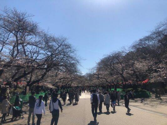上野公園のメインストリート「さくら通り」は、満開時には頭上を覆い尽くすほどの桜並木で、お花見スポットとして有名です。例年はさくら通りの両サイドにレジャーシートを広げて宴会を楽しんでいましたが、今年はそこにロープが張られて立ち入ることができなかったので、皆さん歩きながらお花見を楽しんでいました。